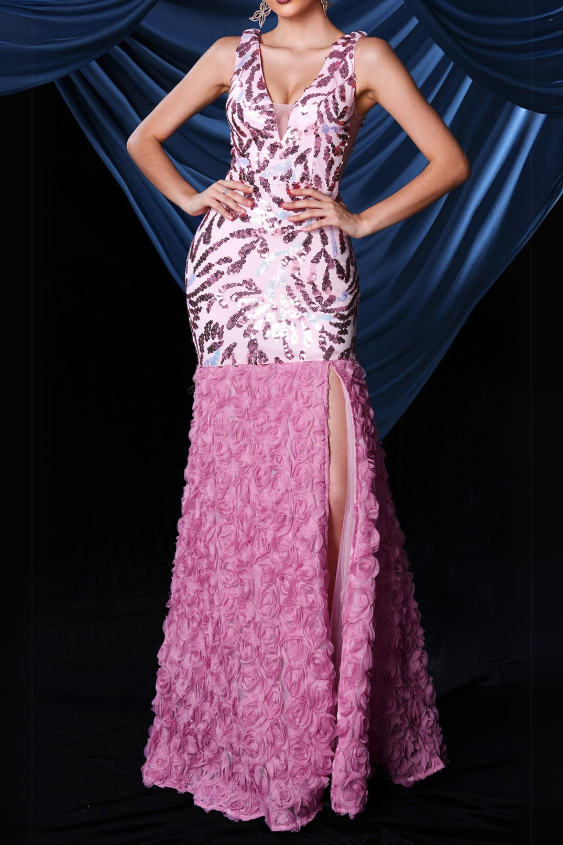 The intricate floral sequin detailing adds a touch of elegance, while the flattering split design allows for effortless movement and comfort. Elevate your style with this stunning dress.