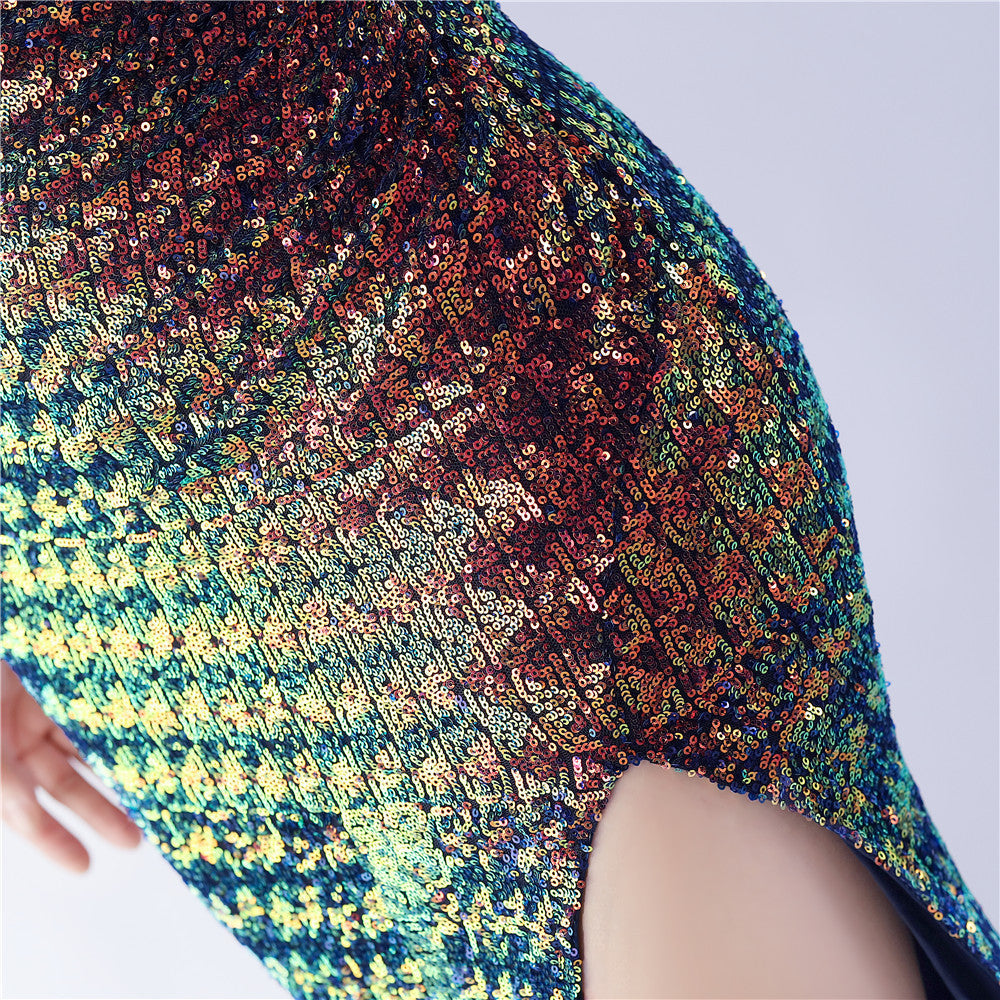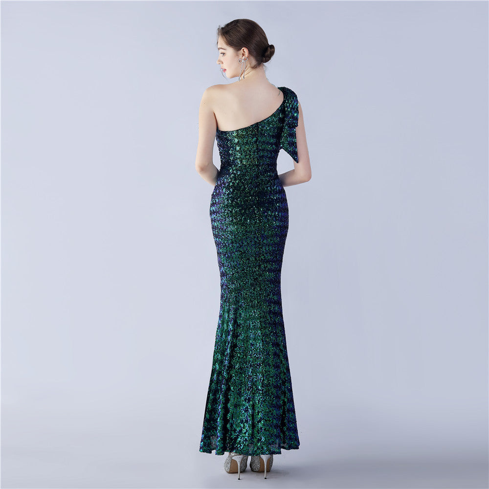 Fur Sequin One Shoulder Formal Dress