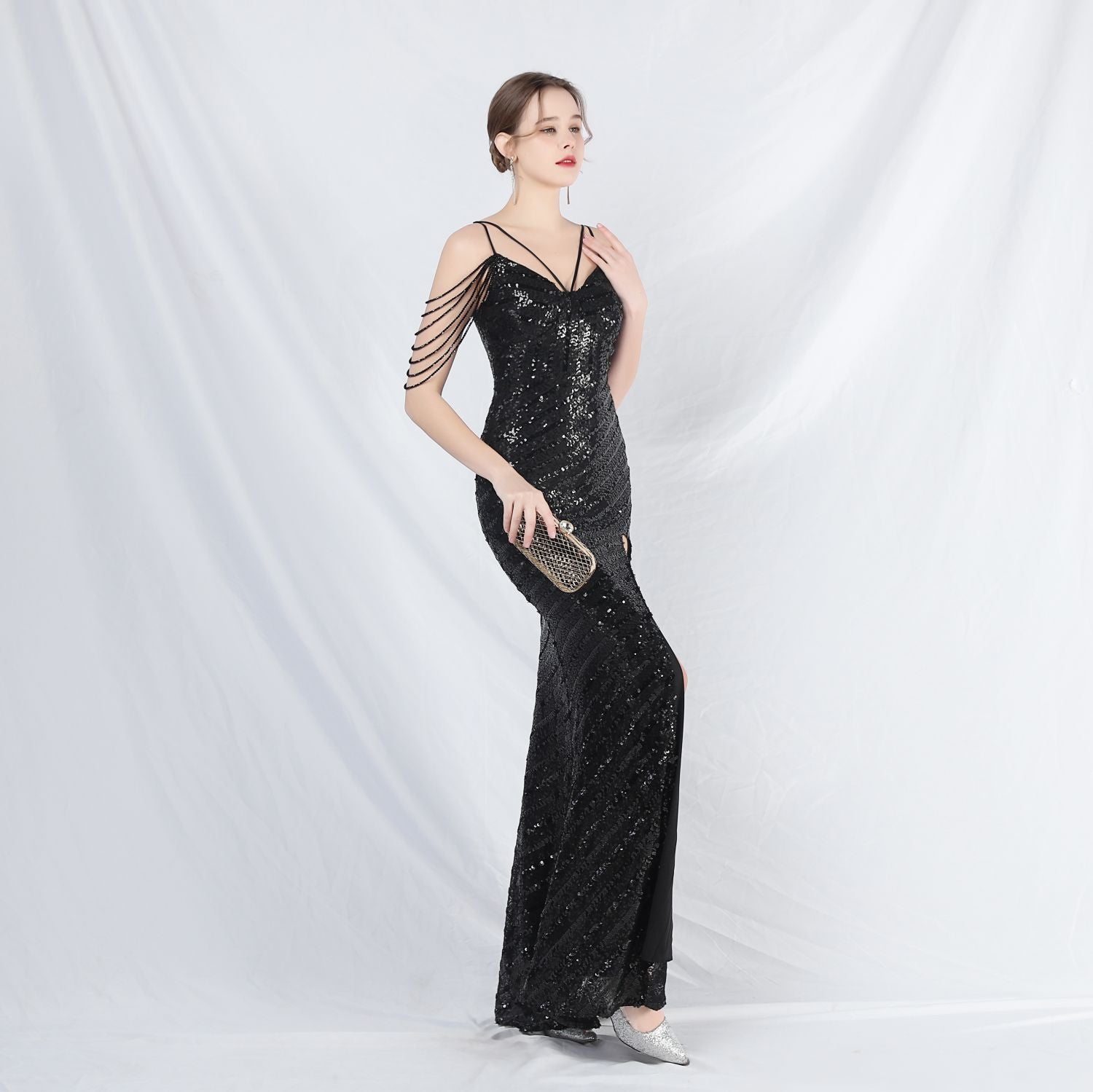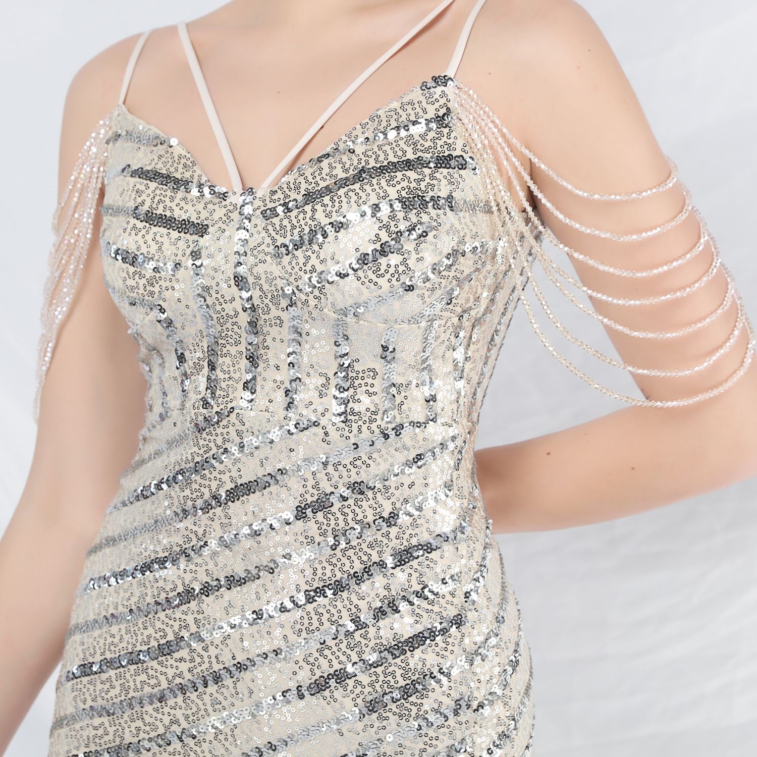Craft sequins + beadwork, with chest pads.