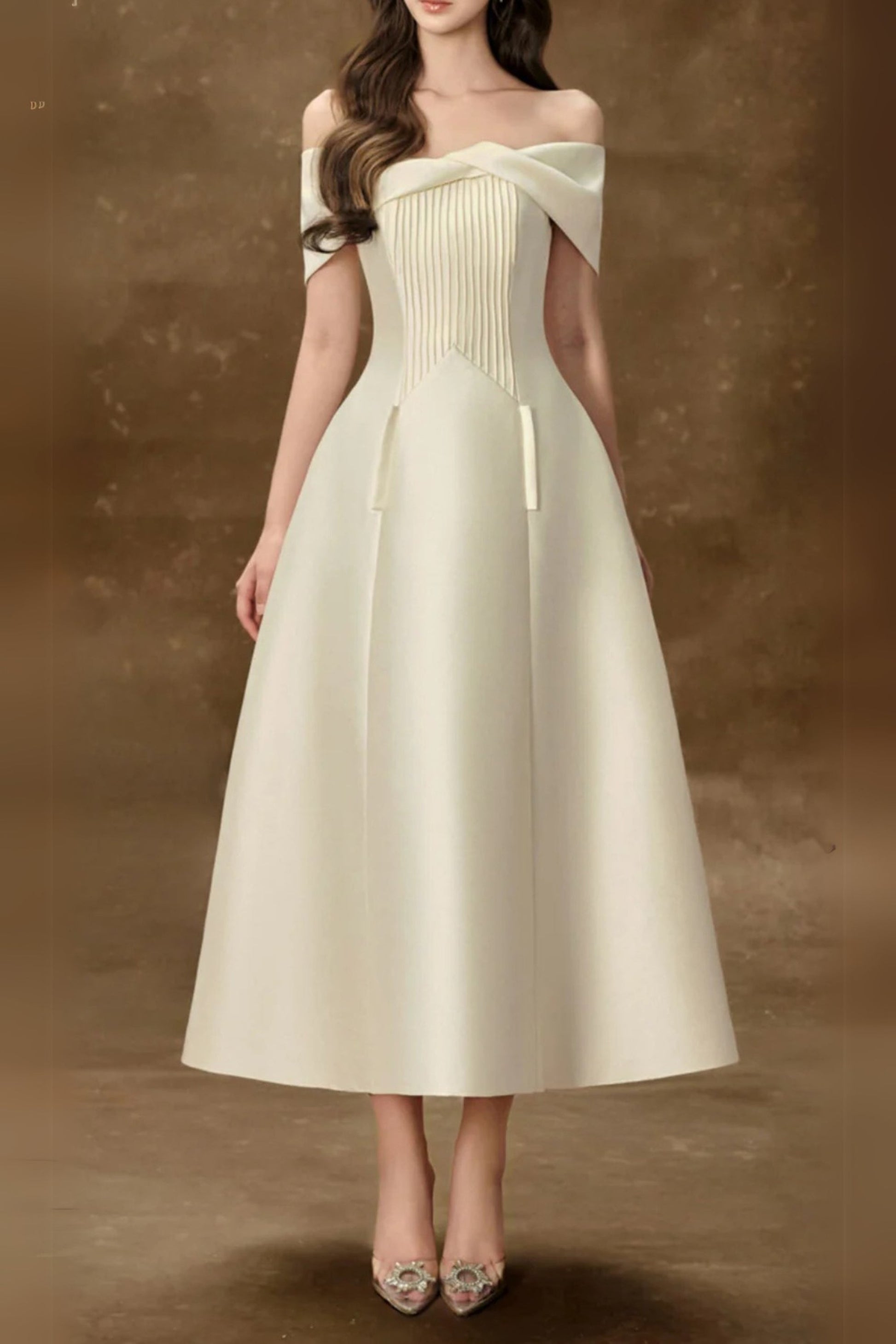 Expertly crafted, the hebera a-line off-shoulder midi dress in cream exudes timeless elegance. The sophisticated a-line silhouette and accentuated waist flatter every figure, while the off-shoulder neckline adds a touch of femininity. Made with high-quality materials, this dress is designed to make you stand out at any occasion.