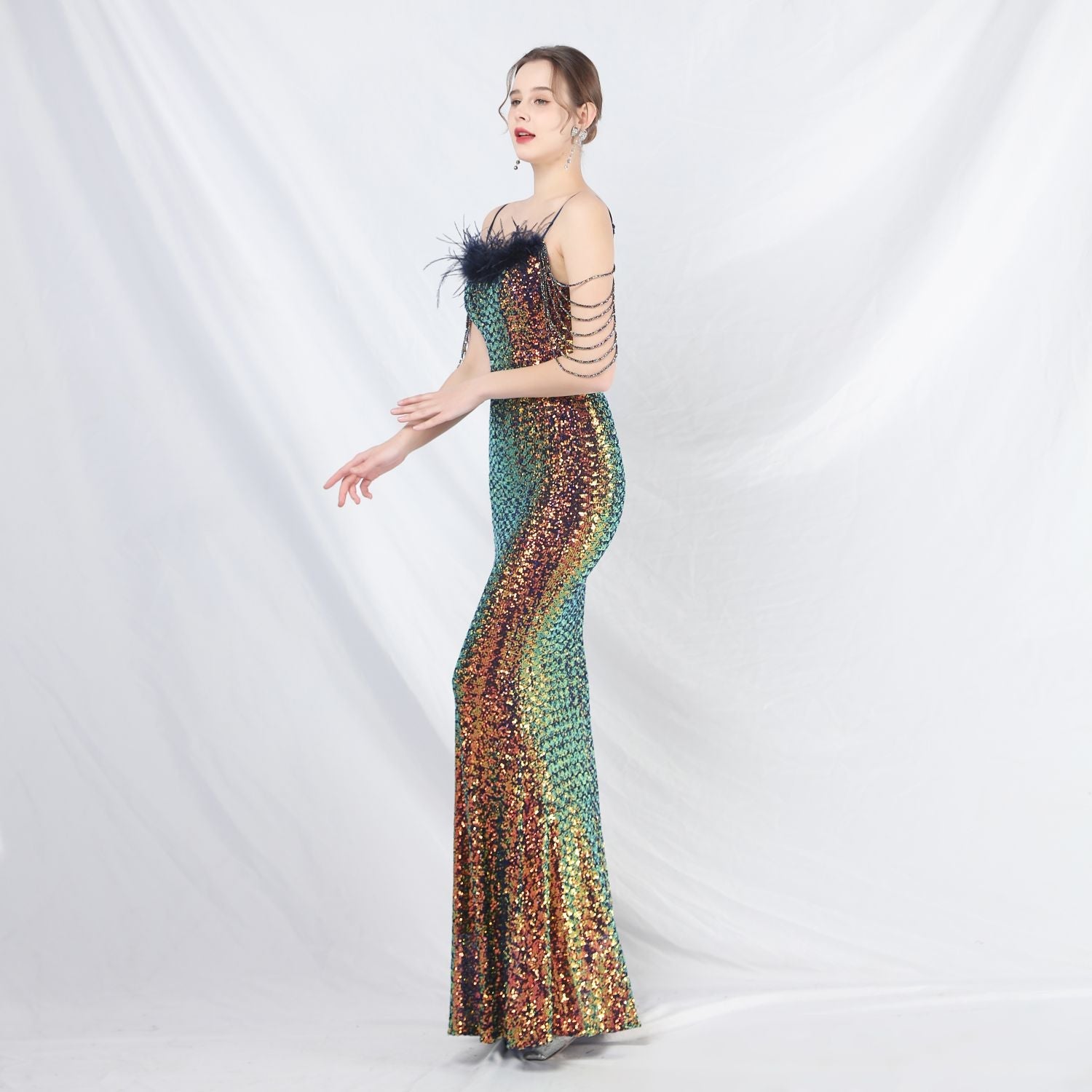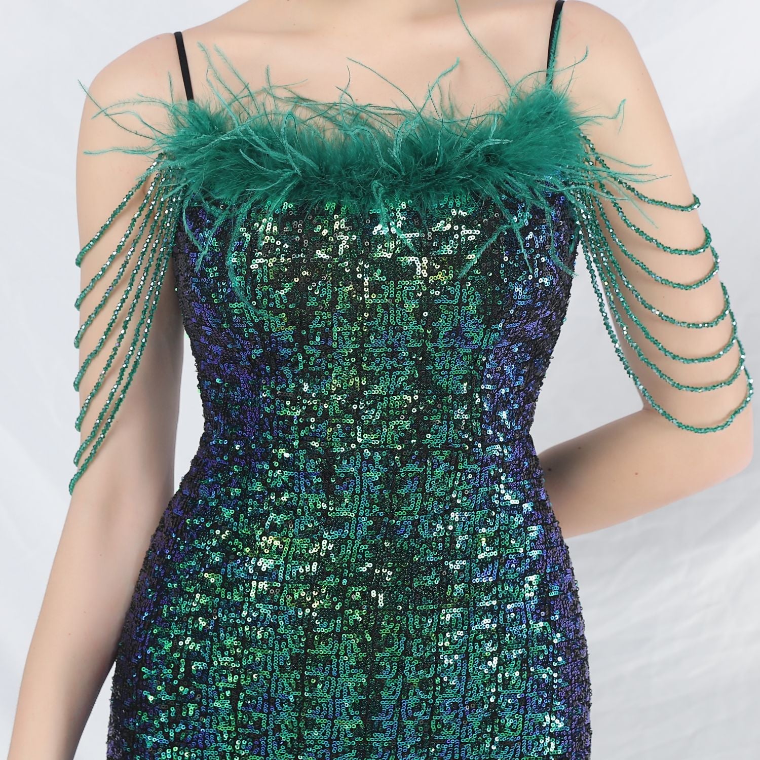 Iridescent sequins + ostrich feather beadwork + intricate beadwork, with chest pads.