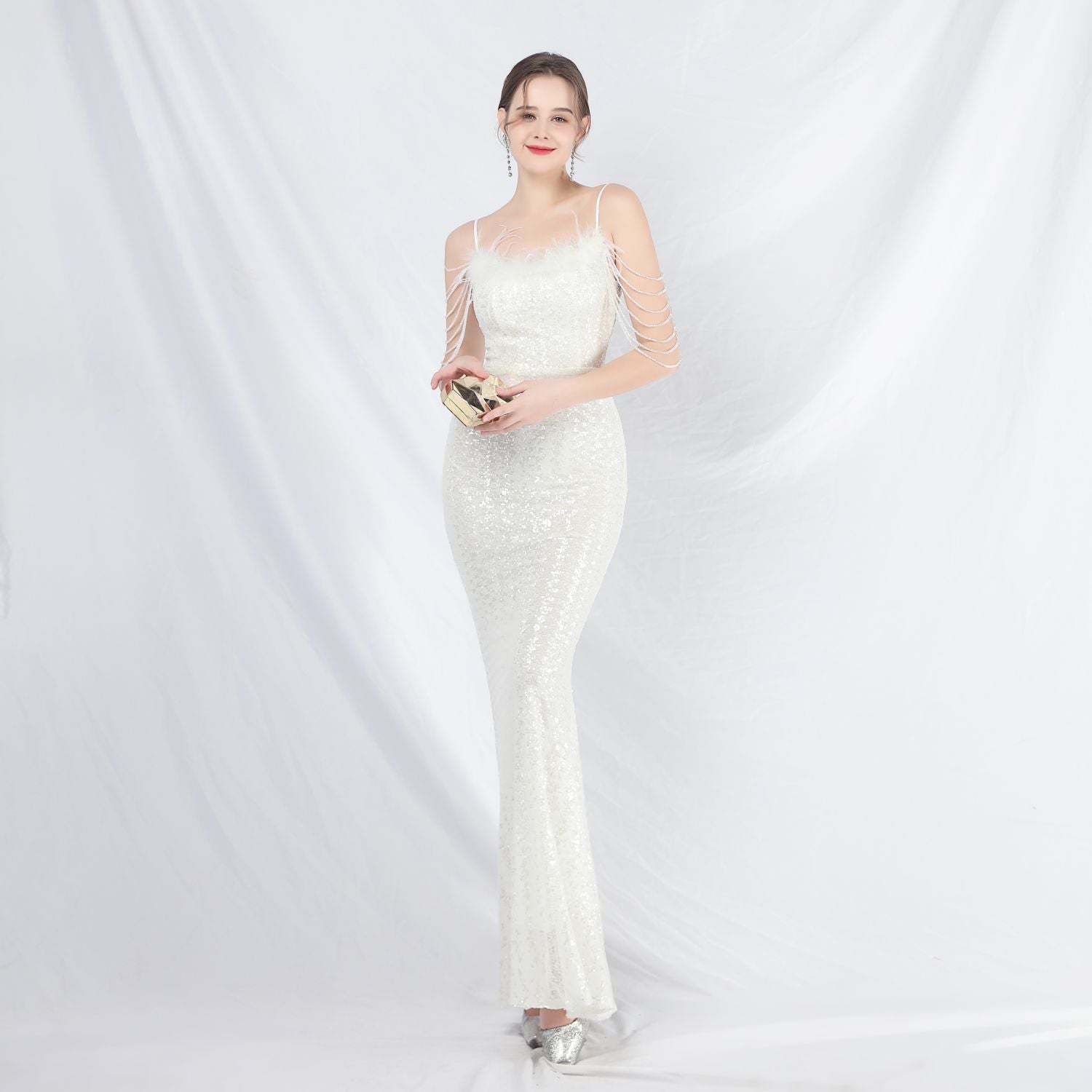 Ostrich Fur Illusion Beaded Formal Dress