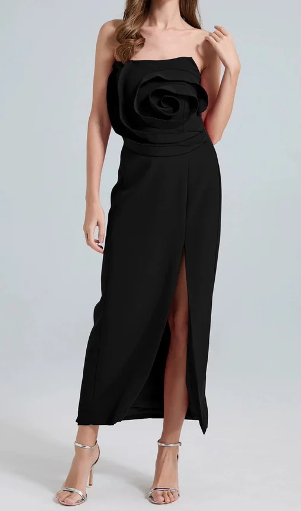 The michelle 3D flower strapless midi dress in black exudes elegance and sophistication. The intricate 3D flower detailing adds dimension and texture to this classic silhouette. Made with high-quality materials, this dress guarantees comfort and style for any occasion.