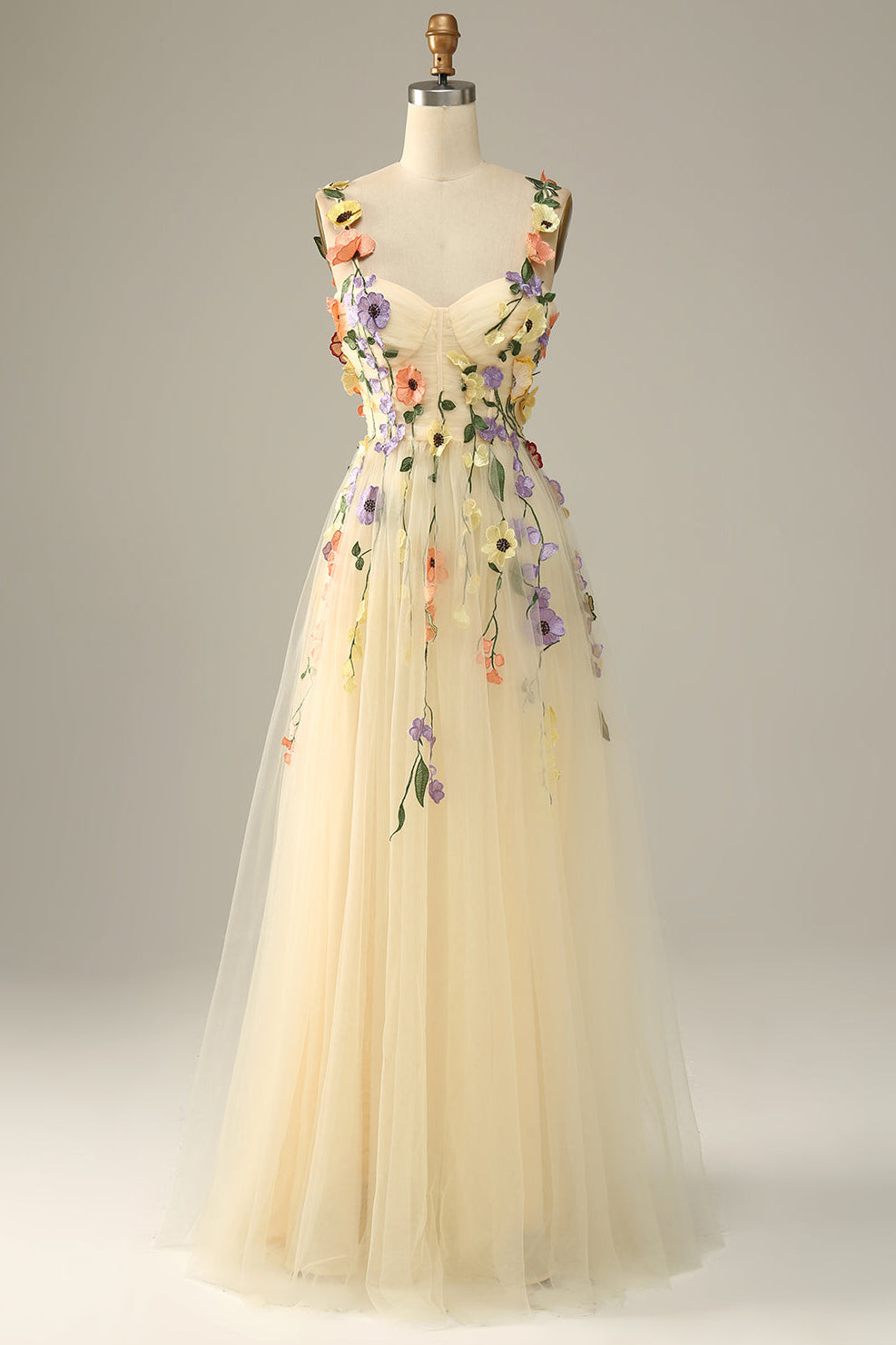 Abito da ballo verde con spalline sottili e fiori 3D