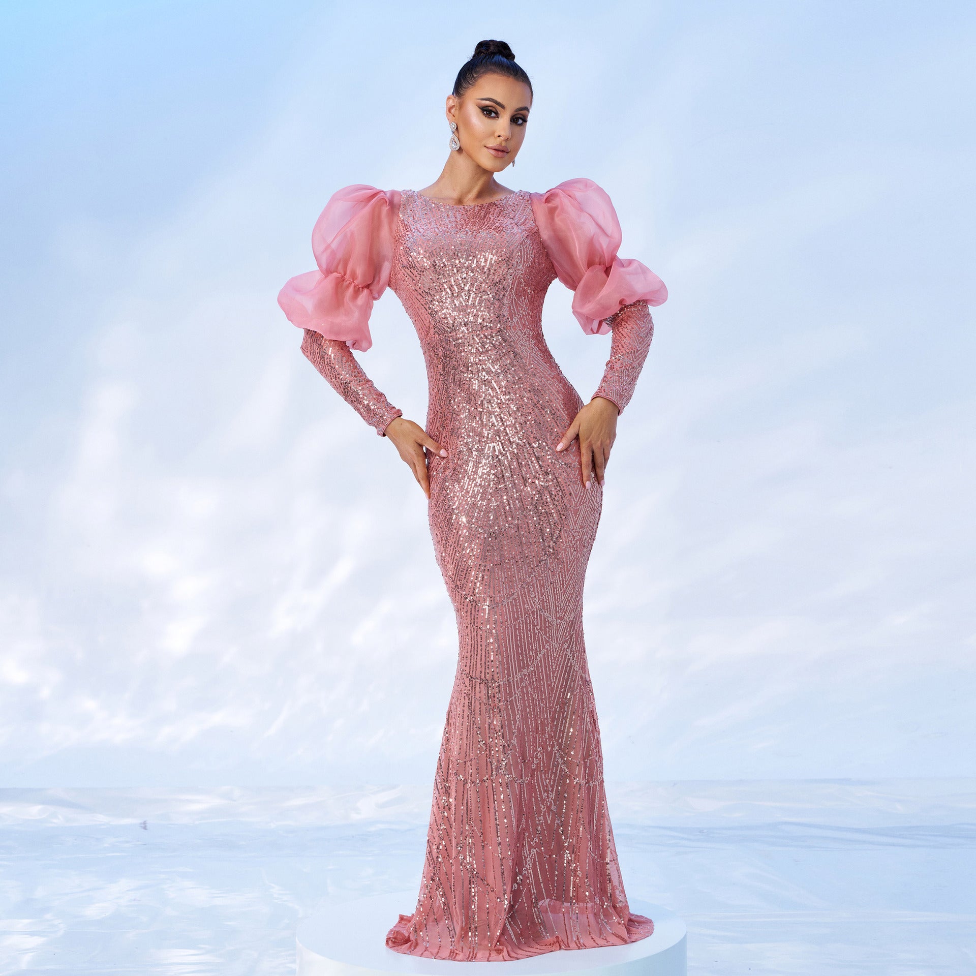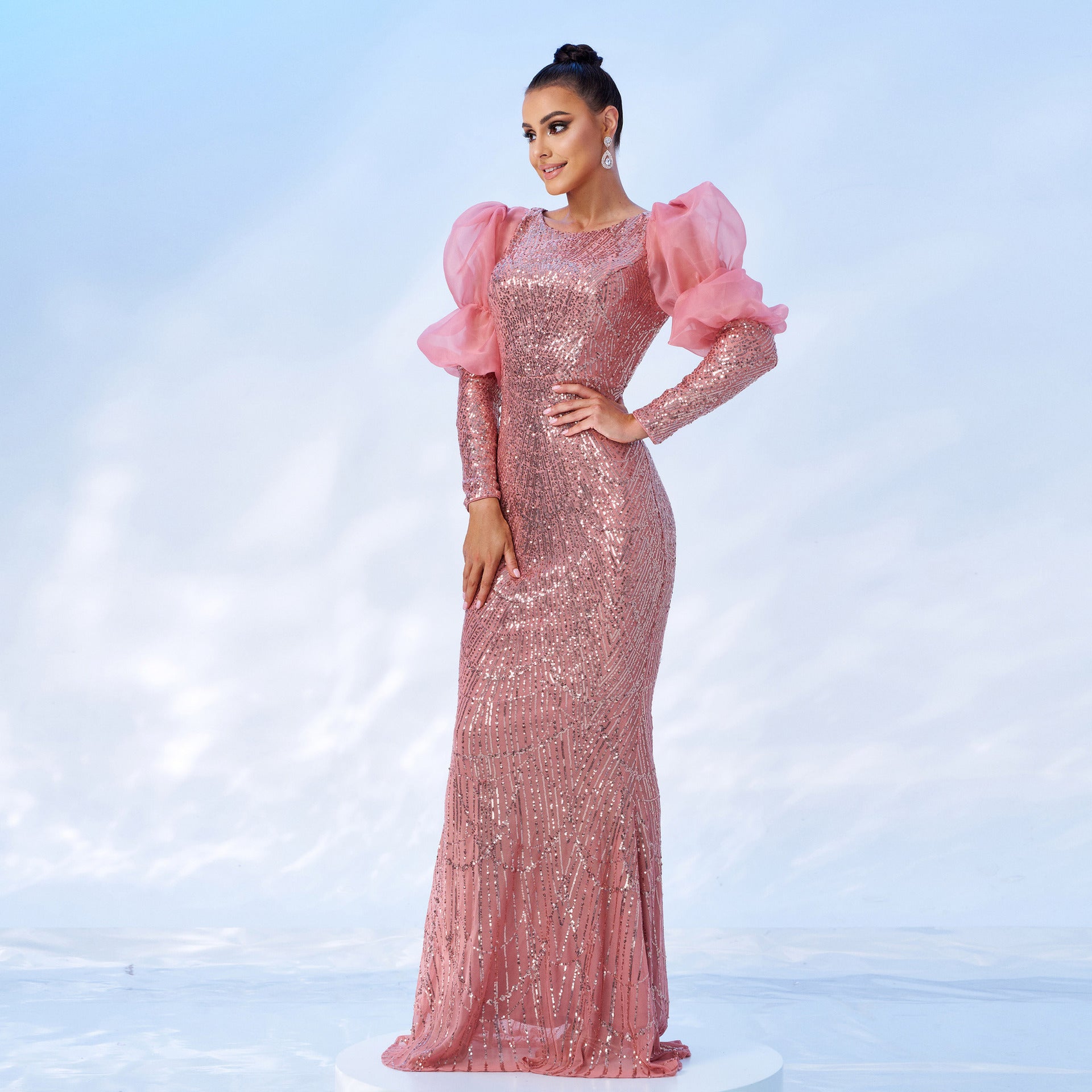 abito lungo aderente con maniche a sbuffo impreziosito da paillettes Vivien in rosa