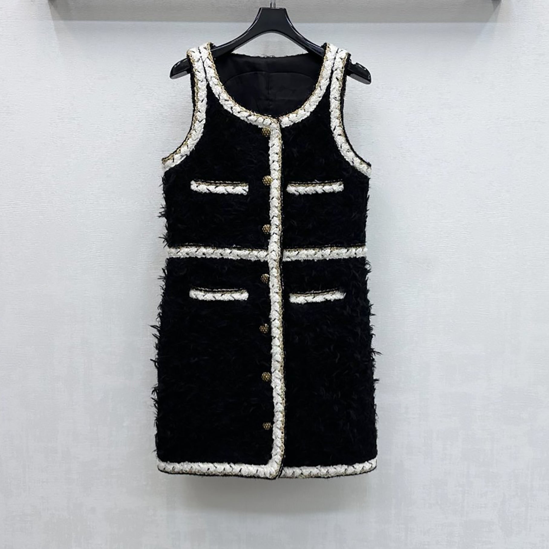 Arricchisci il tuo guardaroba con questo intramontabile abito corto senza maniche in tweed di lana, nel classico nero. Realizzato in pregiato tessuto di tweed di lana, questo capo offre raffinatezza e comfort per ogni occasione. Il design senza maniche offre versatilità: indossalo con un blazer per l'ufficio o con collant e stivali per le uscite del fine settimana. La lunghezza corta e lusinghiera si adatta perfettamente a diverse corporature, mentre il tessuto strutturato in tweed garantisce un look raffinato e curato. Perfetto per chi apprezza uno stile intramontabile e una lavorazione di qualità.
