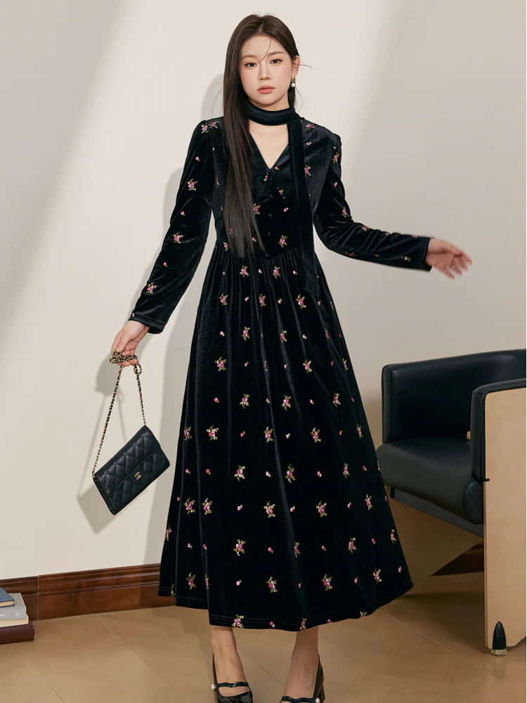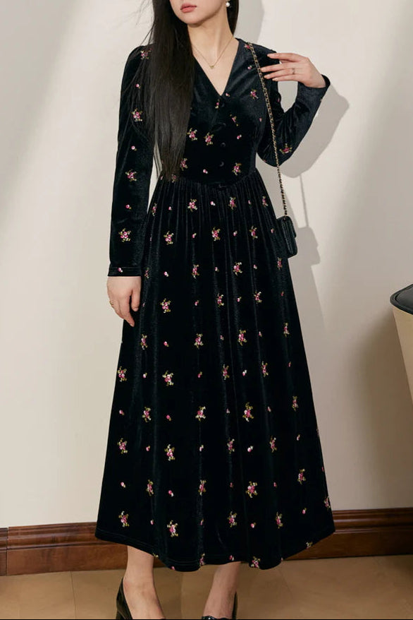 Abito lungo in velluto con scollo a V e ricami floreali Yuri in nero