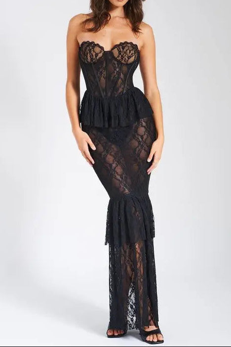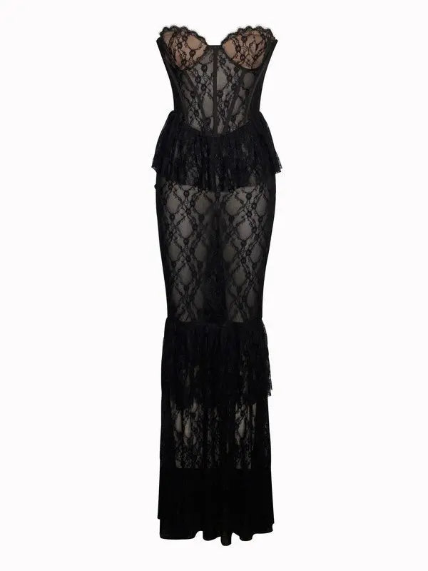 Abito lungo con corsetto in pizzo nero Zen