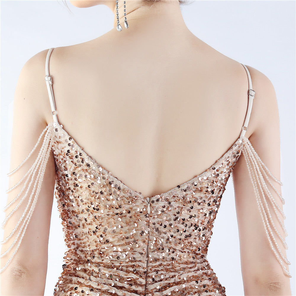 ベルベットのベースに手縫いのスパンコールとビーズのディテール、胸パッド付き