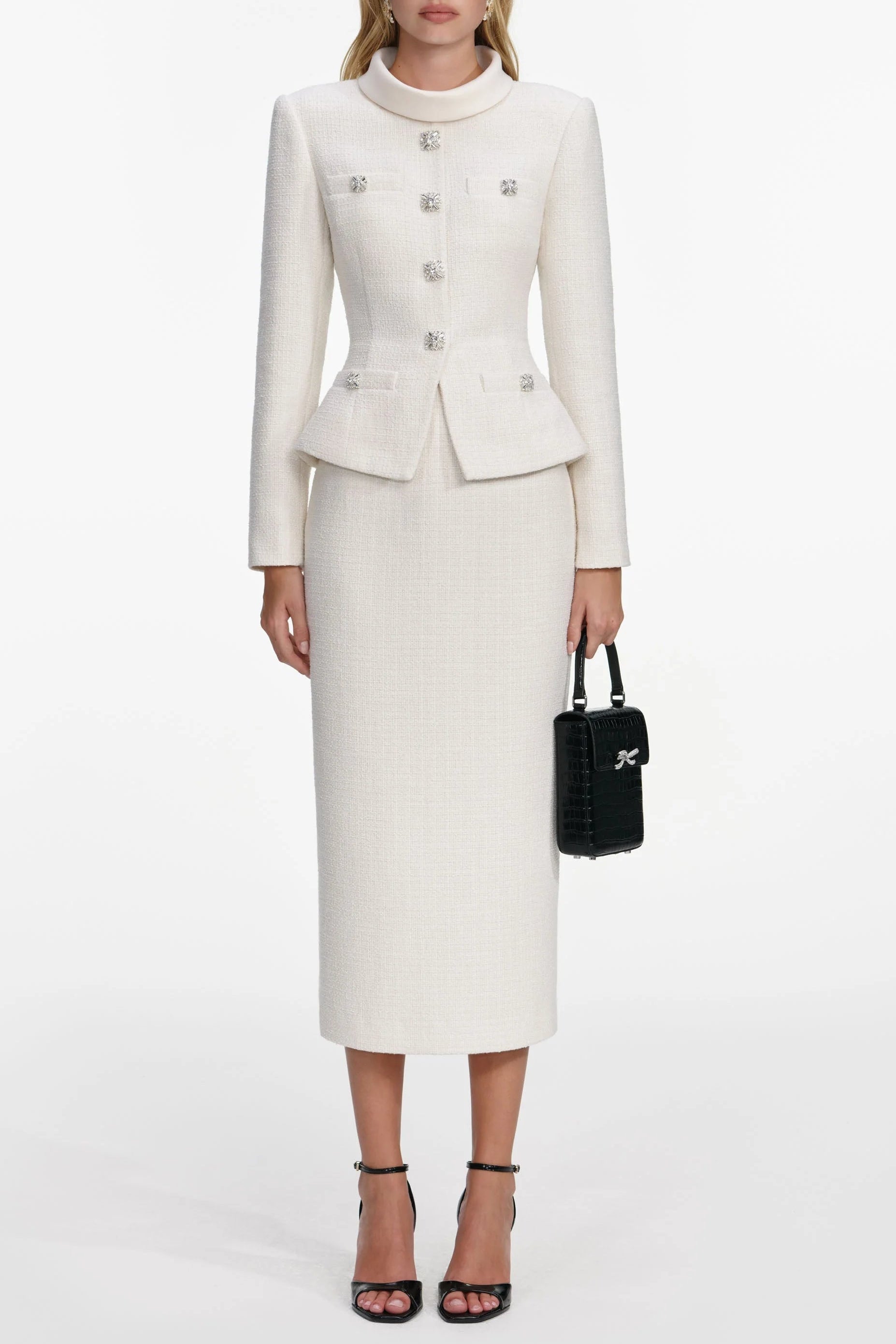 michaeliaのクリームブークレ テーラードミディドレスセットで、ワードローブをワンランクアップさせましょう。この洗練されたアンサンブルは、時代を超越したクリームトーンの贅沢なブークレ生地を使用し、洗練されたシルエットに仕立てられています。ミディ丈はエレガンスと汎用性の完璧なバランスを実現し、ビジネスシーンにも特別なオケージョンにも最適です。しっかりとしたフィット感が体型を美しく見せ、上質な仕立てで長くご愛用いただけます。コーディネートできるアイテムも揃ったこのセットは、自信に満ちたルックスと気分を演出するのに必要なものをすべて揃えています。デイタイムからイブニングタイムまで、シームレスに着こなせるワードローブの定番アイテムです。