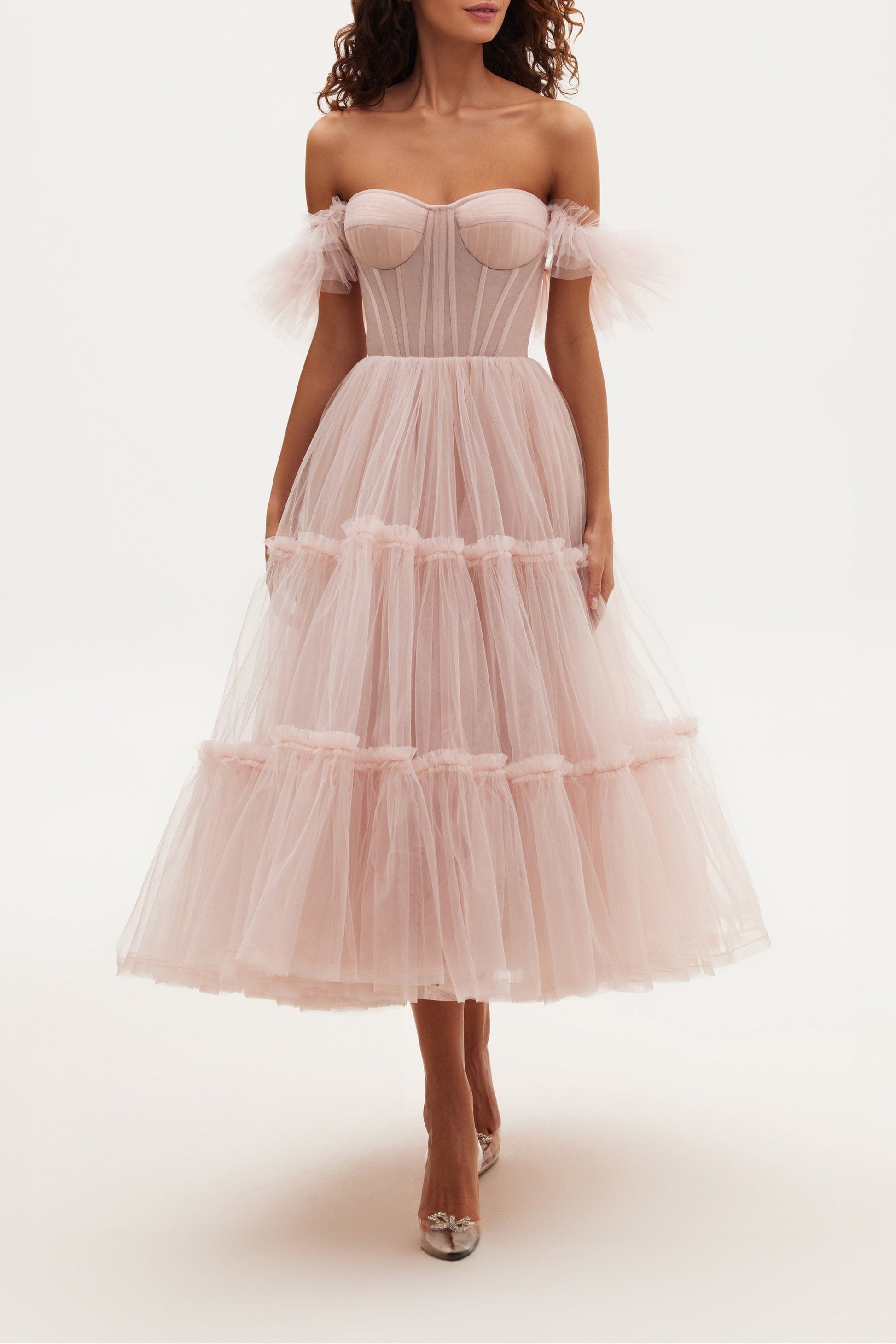 このカクテルドレスはチュール素材で作られています。ビスチェは半透明で、背中にはコルセットレースが施されています。ドレスはR字型のフルスリーブで装飾されています。チュールスカートには部分的に裏地が付いています。
