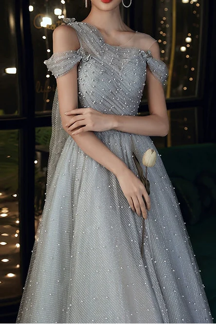 Dusty Blue one-shoulder pearl maxi tulle evening dress