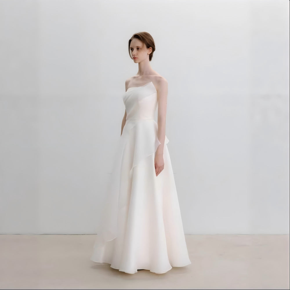 Embodying the serene elegance of French forest couture, the Lyuba Gown is a masterclass in minimalist luxury, crafted for the bride who seeks quiet sophistication. Draped in a weightless ivory organza-satin blend, this strapless gown features a sculpted square neckline that frames the collarbone with understated grace, paired with a tailored, slim-fit bodice that cinches the waist to create a refined, elongated silhouette.