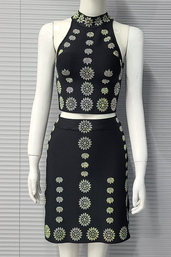 A luxurious and alluring two-piece set made from bandage, designed to make a bold and glamorous statement. The set comprises a halter-neck top paired with a matching mini skirt. The show-stopping element of this set lies in the front of the set, where the surface is covered in big crystal details. The crystals add a sense of opulence and glamour to the bandage set, turning it into a stunning piece fit for special occasions or glamorous events.
