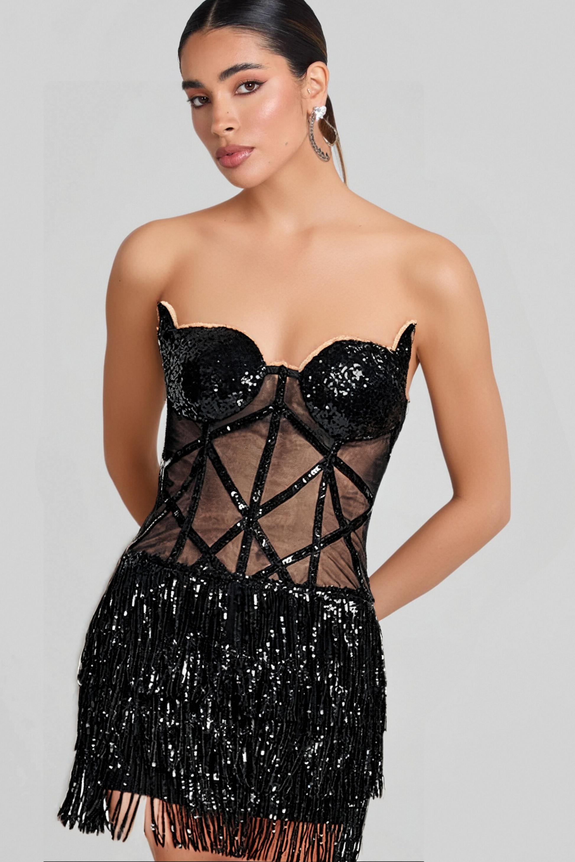 BLACK MESH SEQUINS BEADING CORSET MINI DRESS